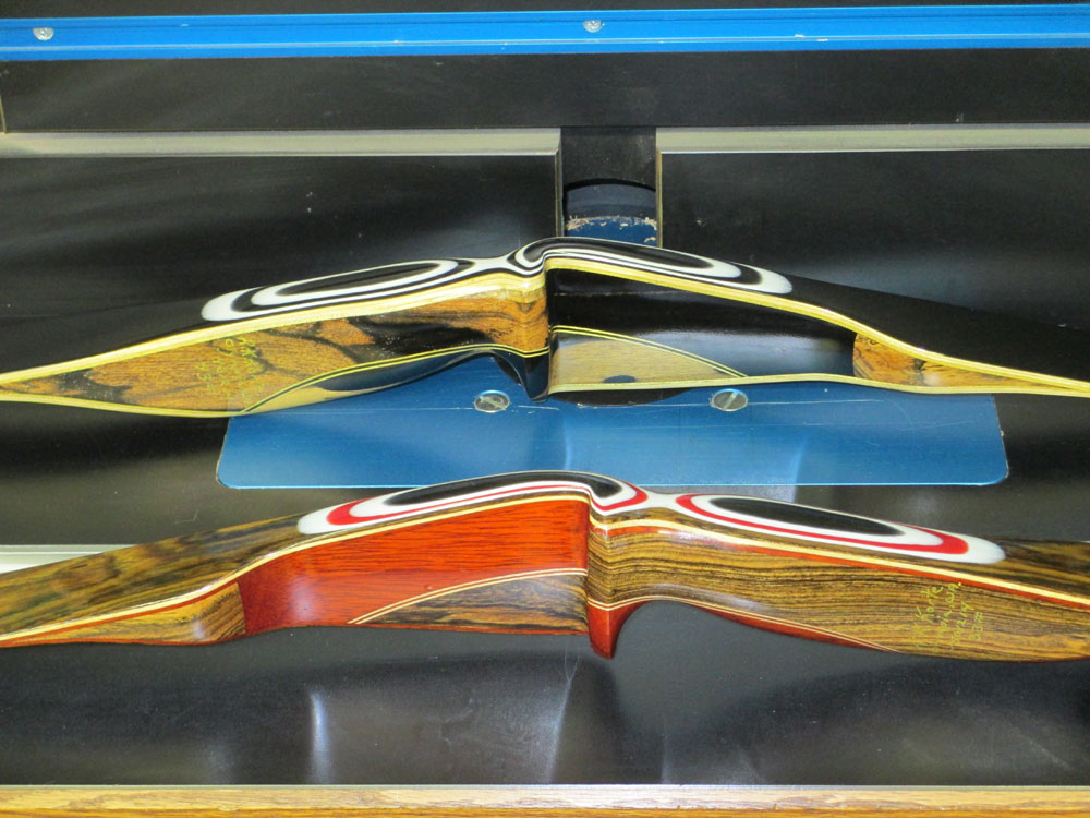 Below is a photo of two of my latest recurve bows. The are replicas of the famous 1960 Bear Archery Kodiak Deluxe, a classic bow which was only manufactured for one year. The top bow riser is made of black and white ebony combined with Gaboon ebony and Yellowheart.