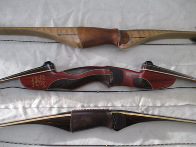 This photo shows three of my earlier bows. The top and bottom bows are the longbows I use for hunting, and the take-down bow in the middle I built just for fun.