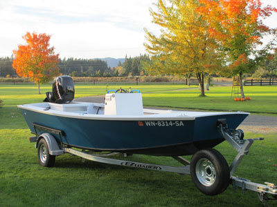 Here's my latest boat, a Glen-L designed 17' jet sled with a conventional 60 hp Mercury motor and an 8 hp Mercury kicker motor. I use it mainly for lake fishing and salmon fishing here in Washington State's Puget Sound. It's made of marine plywood on convential fir frames with Ash trim. All the white areas consist of a product called Raptor truck bed liner, a product which can be tinted any color and easily sprayed on any surface.