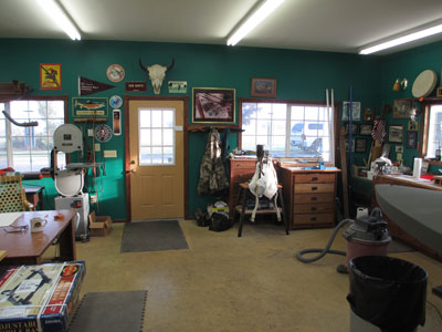 to be moved in and out. A back door allows access to a 28' by 12' lean-to, in which I store my fishing