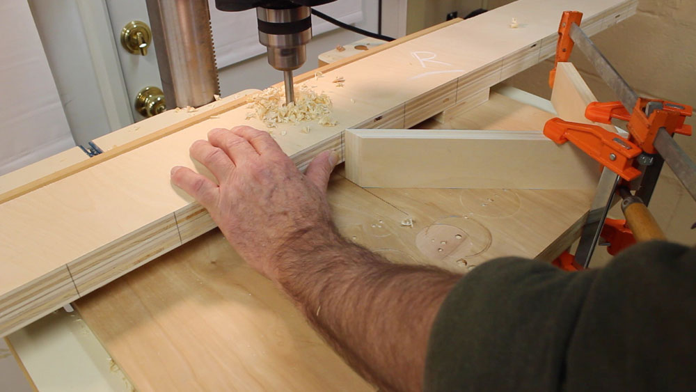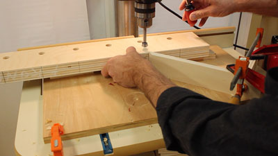 Drill the wall side holes first using a 3/4" Forstner bit. Set the fence to establish the distance from the wall-side of the standard and set up a pointer that when aligned with the mark on the edge of the boards positions the drill bit correctly. Use the pointer and start drilling. Once all the wall-side holes are drilled, reposition the pointer to accommodate the 1/8" offset, reposition the fence, and drill all the outboard holes. Make sure to keep the pairs of Standards together and pay close attention to which is "top" and which is the "bottom."