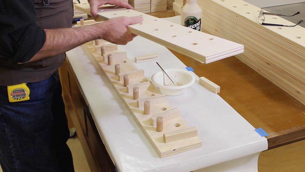 Glue-up is easy. Glue the wall-side dowels into the holes in one vertical Standard piece. Then position the spacer blocks between the dowels, apply glue to the holes in the other vertical Standard piece and press the assembly together. The spacers spanning the width of the standards will keep the pieces parallel until everything dries. You shouldn't even need to use clamps.