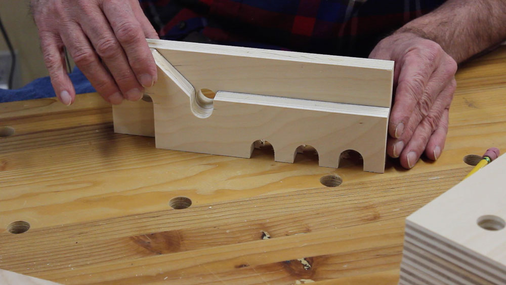 While fairly simple in concept, the Clamp Brackets can be challenging because the position of the two notches that engage the dowels in the Standards is critical. Consistency in alignment of the notches that hold the clamps is also important so that multiple Clamp Brackets line up and clamps are held level and securely.