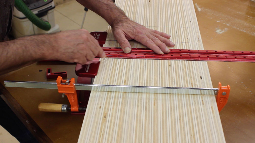 Now gang all the pairs together, clamp them in alignment with your drilling guide on top and transfer the wall-side hole locations to the edges of all the boards. Do this step carefully using a saddle square and a t-square. Then it's back to the drill press!