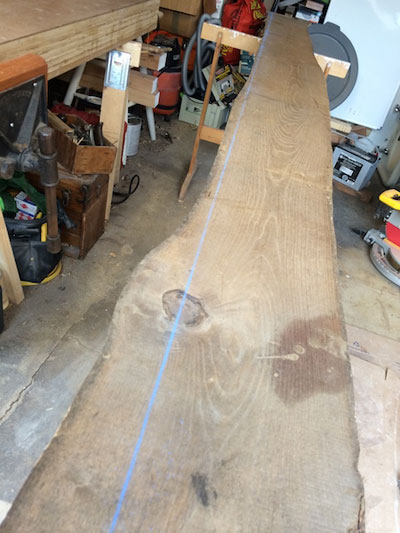 Back to the work, a jack plane and no. 7 jointer finished what the circular saw started in cleaning up and squaring a working edge for the table saw. Because of the weight and length of the plank I didn't trust my 6" Jet jointer to generate a clean edge, so the only way to get it done was by hand! A sawhorse provided additional support of the long heavy plank off the end of my six foot bench. The clean edge revealed a golden yellow color of the fresh cut lumber, with a close, tight grain structure.