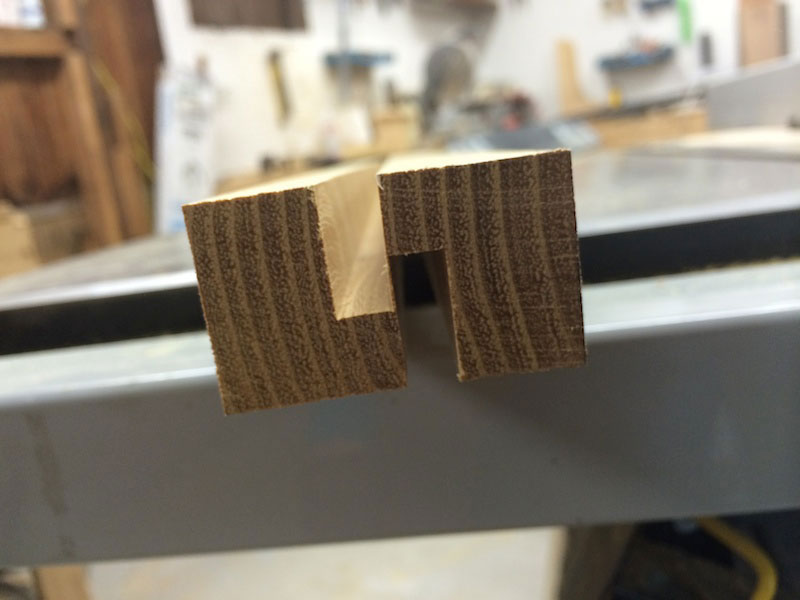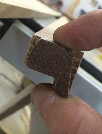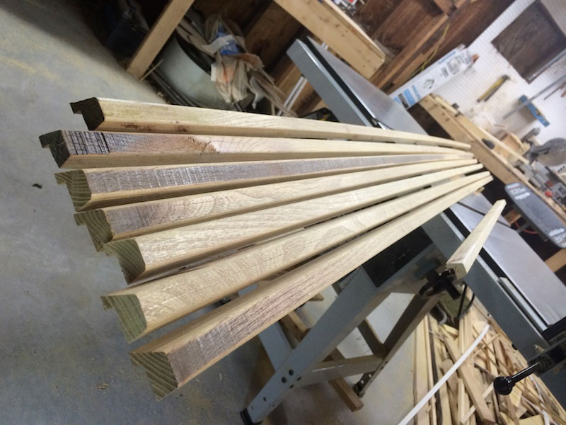 After ripping the blanks and cutting grooves in each strip, I could peel the two sections apart and clean up the inside edges with a small block plane. I was careful here because with this wood the splinters are STRONG and hurt! These first few milling steps yielded 7 full-length toe rail blanks and an extra shorter length, which is more than enough for the whole boat. Each oversized, blocky blank was then cut with the two side angles before easing the top edges with a moderate round over on the router table. Because all of these parts are the same, I was able to minimize my tool setup efforts and make all of my cuts uniform in the least amount of time.