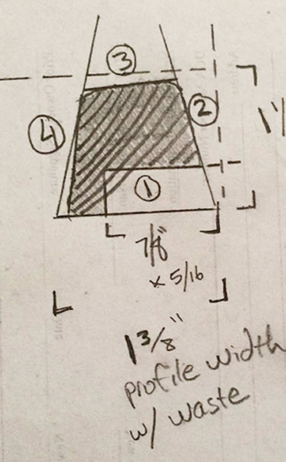 So with a straight edge and a flat plank, away to the graph paper I went. With a plank this heavy, and a desired finish profile that could fit within a 1"x 1.5" rectangle, the table saw could cause a lot of damage and waste quickly without a planned series of cuts. Each toe rail has a cross section like a flat-topped pyramid, with a rabbit in the wider base. I kept some of the broken teak toe rail, and cut out a few cross sections to use as a reference model. This time spent considering the target shape, determining the angles, and taking measurements was invaluable for the end result.