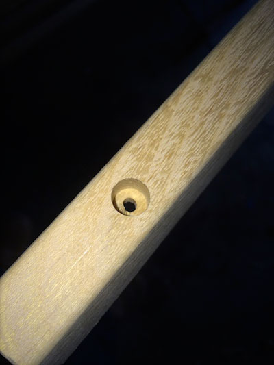 Preparing the new rails for installation took me on a new adventure with another machine shop tool, the drill press. If you have a large number of counter-bored holes to drill in a series of parts, drilling by hand can't compete! After a bit of math and layout, I started with a forstner bit sized to match my tapered plug cutter. The depth stop ensured consistency and a fence allowed me to slide the toe rails along the drill bit from mark to mark efficiently. After all the counter bores were cut, a simple bit change allowed me to drill the clearance holes centered using the same setup. This close up shows the blonde/yellow color of the freshly sanded rails, as well as the cross-linked grain structure.