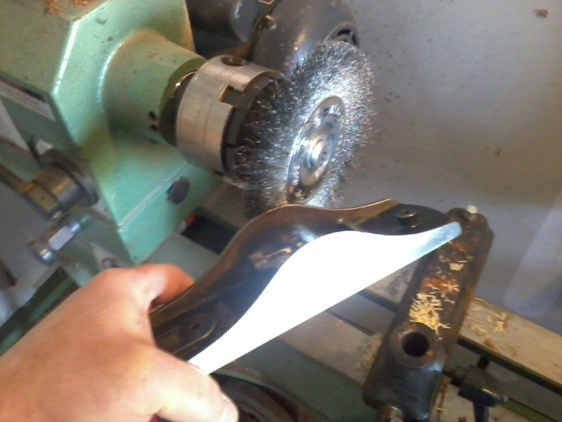 The first thing to do is to break down the plane and clean all the parts. To remove old grease, oil and wax, I like to soak all the parts in mineral spirits and work them over with an old toothbrush. As for rust you can submerge the parts in a citric-acid solution of ½ cup citric-acid powder to 1 gallon of water overnight and/or use a wire wheel attached to a drill or other tool. It can take as long as 24 hours of soaking to remove heavy rust. Citric acid powder is used in candy making, so you can find it in some grocery stores. If you use the citric-acid solution, it's important to thoroughly dry the parts after they come out of the bath, use steel wool or a Scotch-Brite pad to remove the carbon precipitate left on the metal by the chemical reaction and quickly oil the parts to prevent flash rusting. While the parts were soaking, I repaired the rear tote and turned a new front knob.