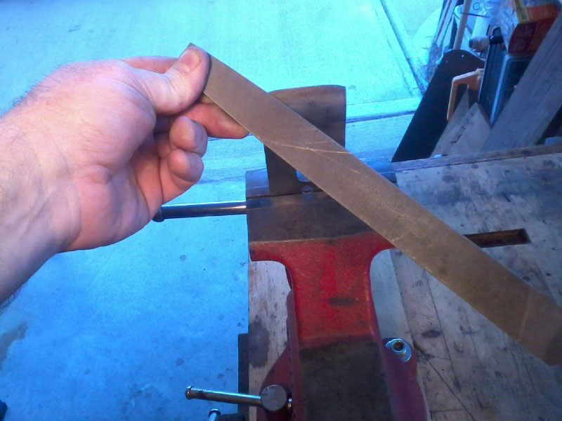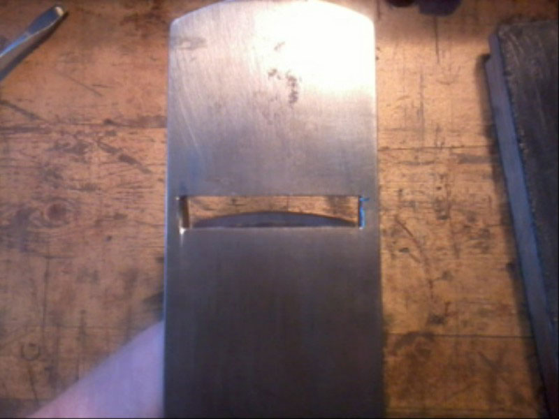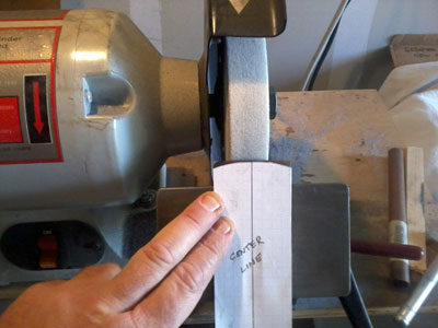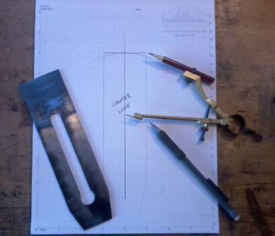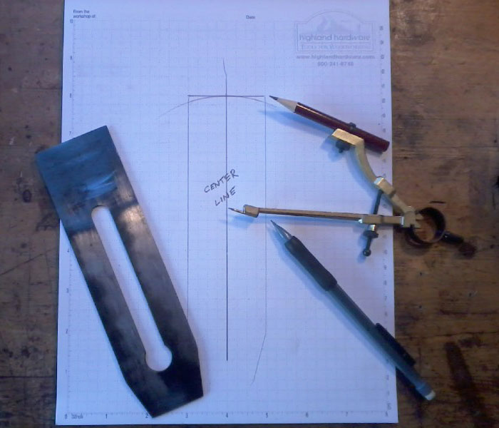 To layout the new blade radius you'll need some graph paper, a pencil compass and some school glue. Trace the blade of your plane onto the graph paper being careful to place it so that one of the graph lines establishes a centerline. Now decide how much of a radius your scrub plane will have. I chose a 3" radius because it looked right to me. Just open the pencil compass until the distance between the steel pin and the pencil point is the radius you want. Next, put the pencil point on the centerline of your drawing just below the cutting edge and the steel pinpoint on the centerline below that and draw the arc. With a pair of scissors, carefully cut out your blade radius pattern and glue it to the back of your blade. School glue sticks work great because they dry fast and the paper is easy to remove from the blade once you're done. Now head to the bench grinder and let the sparks fly! Keep grinding until the blade matches the pattern. Once the grinding is done you can file the chip breaker to fit the new blade radius. Don't get too obsessed about getting this part perfect. The chip breaker's main job now is to provide a slot for the blade advancing Y-yoke to fit into.