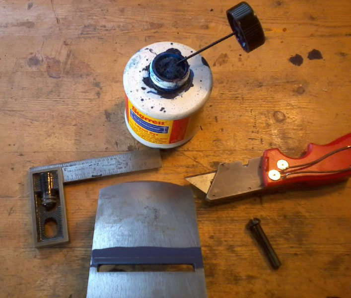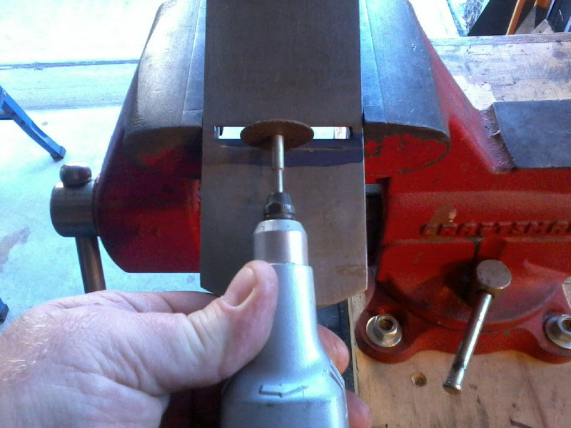 A smoothing plane relies on a tight throat opening next to the cutting edge to reduce tear out, but a scrub plane needs plenty of room to clear the large chips it produces. You might get lucky and determine that your plane already has a wide enough throat opening. If that's the case, put the thing back together and you're done. Although, chances are you'll have to file, grind or cut the throat opening back some amount. With some machinist's layout fluid, color the sole of the plane just in front of the throat opening. Measure the amount of opening you want and scribe a square line through the layout fluid after it has dried. I had to remove 3/16", so I chucked up a fiber reinforced cut-off wheel in my rotary tool and cut to the scribed line. This is a fairly nasty chore so wear a full-face shield and a good dust mask. Also make sure the plane body is securely held in a sturdy vise. Once you finish the coarse cutting, clean up the tool marks with a file and reduce any rough surfaces on the plane's sole that can scratch wood.