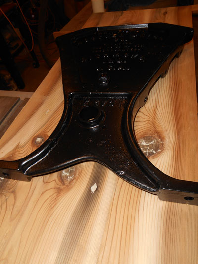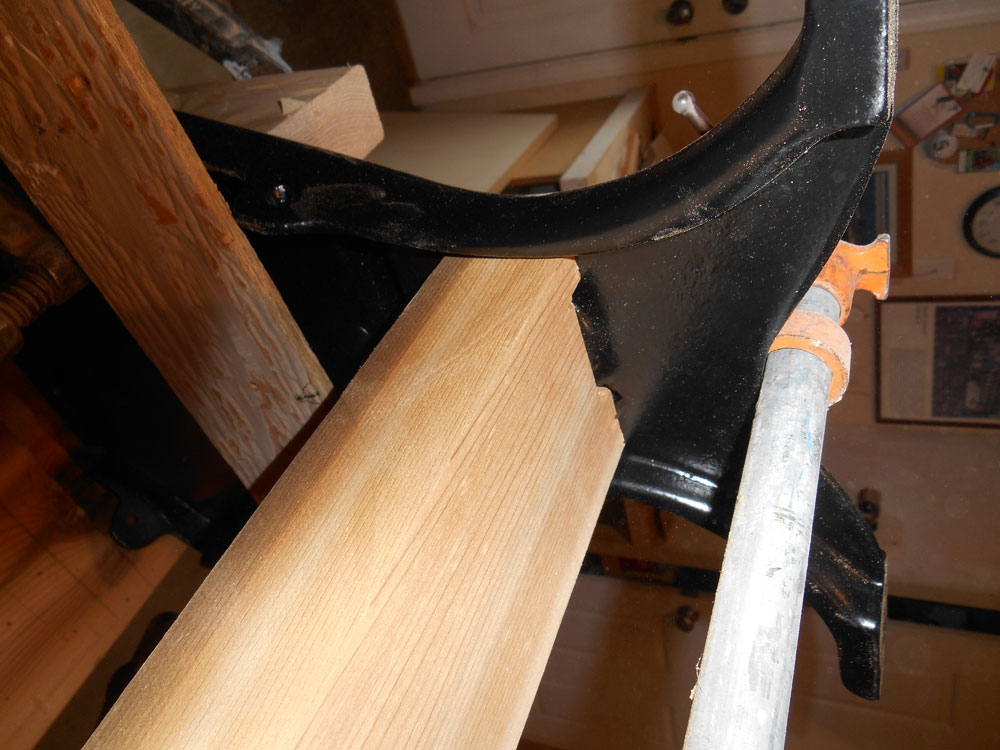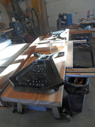 While I was milling the wood parts, the castings were delivered to a powder coater for sand blasting and painting. The castings and screw fasteners were coated with a matte black finish. When the coated pieces were returned I faced two design problems: how to mount the stretcher and how to install the knee braces for maximum stability. I chose to mount the stretcher using two existing holes in the cast iron. I drilled a 1 ½ inch hole in both ends of the stretcher and turned a wood 1-1/2 inch dowel that would extend through the casting and into the stretcher. Finally, a hole was drilled in the casting to allow a mounting screw that would keep the stretcher from rotating in the casting holes. After the knee brace pieces were cut to the correct length and angle, I added shallow mortises to the underside of the top to contain them. This reduced the shear on the screws that attach them to the top. The other ends were attached with screws through holes drilled in the castings.