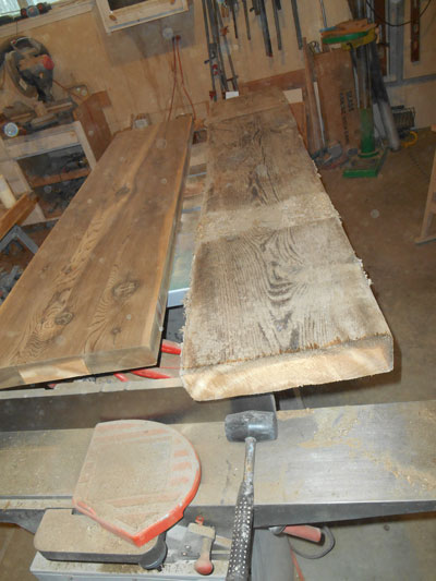 Our first design challenge was choosing the material to use for the top and stretchers. We decided to use barn planks that were available on the property. These planks were 3 by 12, rough sawn and weathered. I could not identify the species immediately but speculated they were either white or ponderosa pine as these are predominate species for the area. He brought me three pieces of a single plank that were 60+ inches in length.