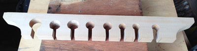 Since the Hirsch and the Japanese chisels I owned had handles that were permanently attached, I could make the rack in a number of ways. I could either have holes that sized to fit the point where the neck meets the handle, or if the handles shape flared out from the connection point to their butt, the hole could be sized so some of the handle slips through and engages the hole. On my first rack, I decided to go with the first scenario. I cut a small "entry" path, which was just slightly larger in diameter than each chisel's neck, which met up with holes I created at my drill press. I chose a forstner bit for each of these holes, that was just slightly larger than the ferrule on each chisel, which allowed them to hang securely, as well as looking nice. It was easy enough to get the chisels out for use, and then back into the rack, when their work was done.
