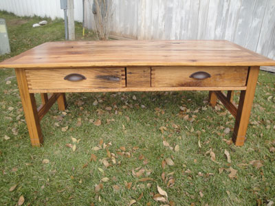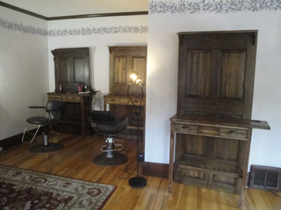 I have a long-time friend who has had a barber shop/salon biz for many years. She recently moved it into a really neat old Victorian house and she asked me to make three work stations for her sisters to work from. She wanted them made from old doors with a half-table with two drawers and a hidden drawer for their cash and a hole for the hairdryers: