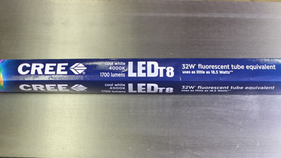 The new LED tubes are made by Cree and are available at some home center and hardware stores… you might have to "hunt" a little to find them, but it's worth it. The tubes are shatter-resistant (they even "flex" a little), contain no toxic mercury, light instantly when turned on, produce outstanding color rendition, and are effectively much brighter than conventional fluorescent tubes.