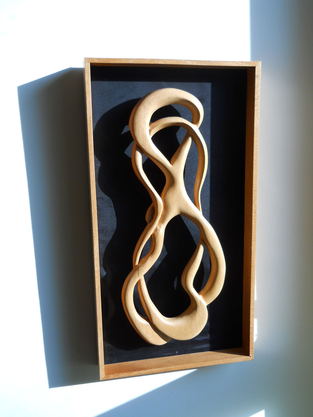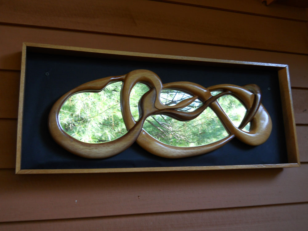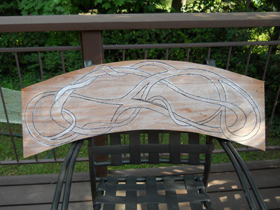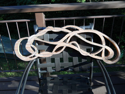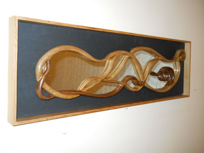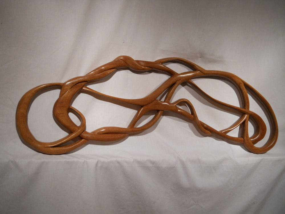 I started wood carving recently. I had gone to the craft area of the Clearwater Music Festival where I saw carvings that were done in Bali. I was intrigued with the way that the carvings seemed to interweave themselves. I bought a piece of mahogany and got started. Now the tools I use are a drill and a jig saw to rough out the shape and then a cabinet makers rasp and a few carving knives. It does take a toll on my wrist, though.