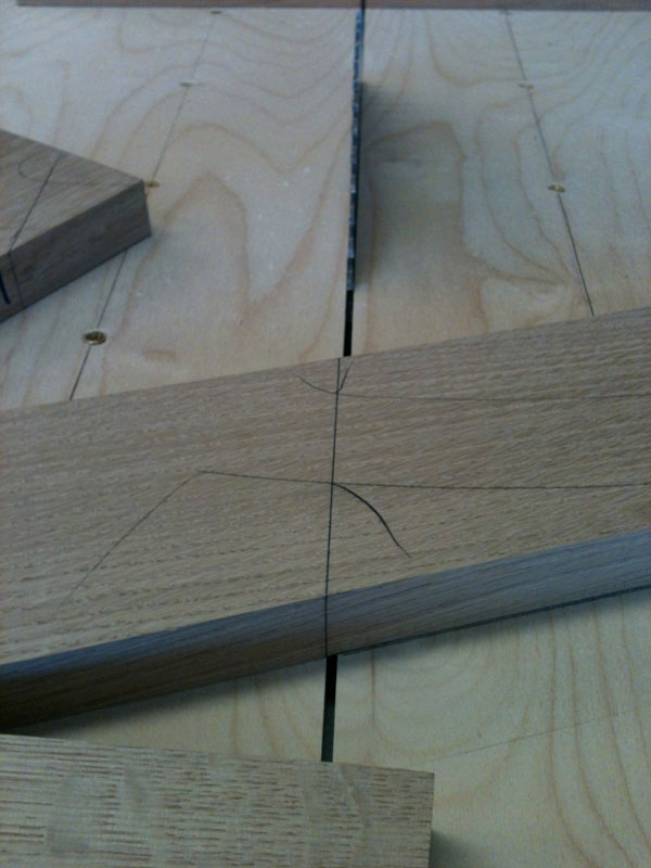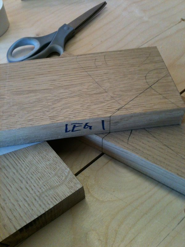 Those templates for the legs and stretchers were then used to lay out the shape on white oak that had been planed to final thickness: