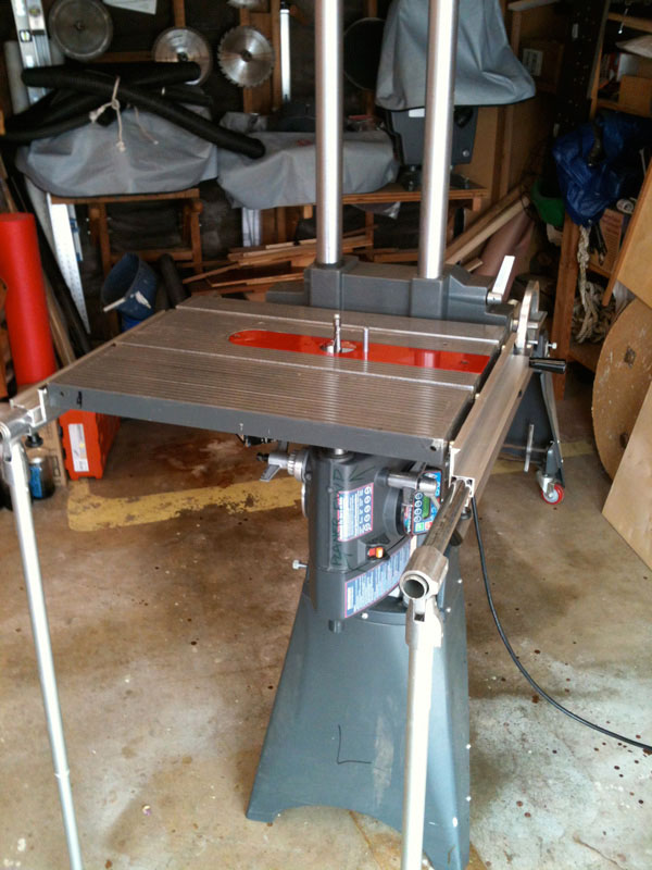 With all of the pieces lined up, glued and holes drilled successfully, I set up my ShopSmith in the under-the-table routing mode with a starting pin and