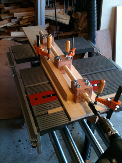 Each of the two stretchers (above) were fashioned on one board each with no joint required. The front and the rear legs did require joints, so before they were bandsawn to rough size for routing, the joint dowel holes were drilled. That gave me more surface to square to the boring bit. If both holes on the mating pieces were perpendicular to the mating surface then I felt confident that I would have minimal gaps at the glue-up phase.
