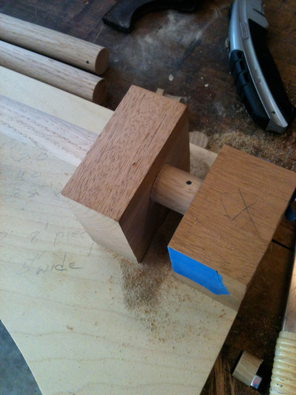 The tenons on each end were cut with a plug cutter that sized the tenon to the exact diameter needed for the holes in the legs and stretchers. A jig held them in place to get all finished tenons coaxial with the body of the dowel: