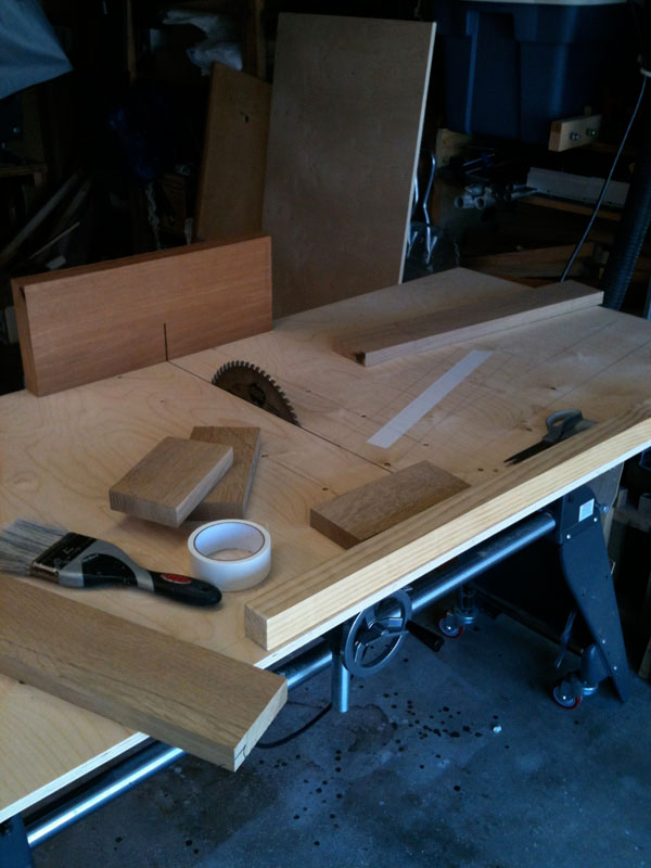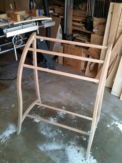 Having that decided, a full-sized paper template was used to rough cut and smooth a plywood template for final routing of the real white oak legs and stretchers:
