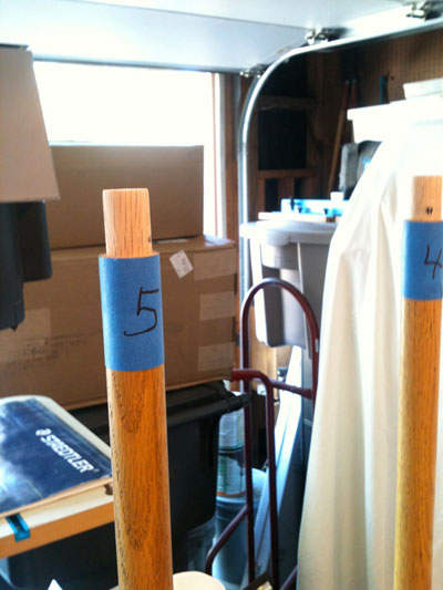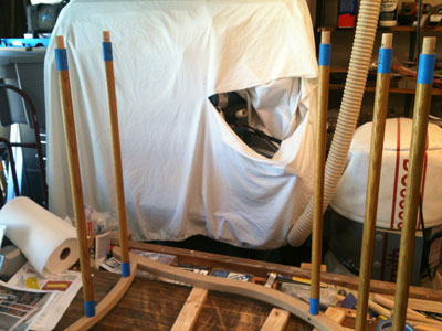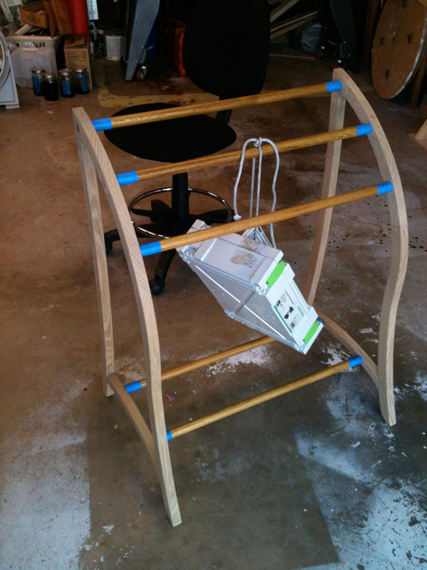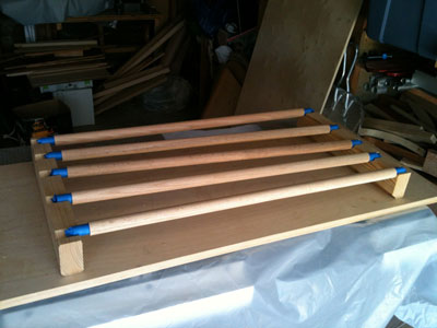 Each dowel was dyed to the agreed color and sprayed with four coats of polyurethane. The tenons were taped to preserve the glue surface: