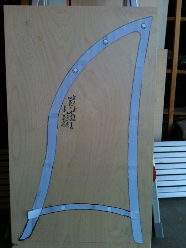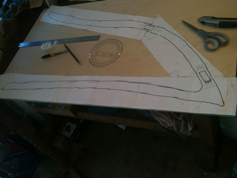 Since I was using the free version, SketchUp Make, I had to manipulate the Document Setup to get a life size printout. By careful selection of only pages with something on them I managed to minimize the number of letter-sized printouts. When the several pieces were rough-cut, they assembled into a full-size diagram with the print lines highlighted: