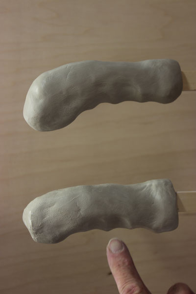 I have "sort of" thought through my next steps. When the shape is finalized I will coat the clay with shellac. Why? I have no earthly idea, but it seems reasonable. Then I am going to mix up some plaster, give the clay "handle" a good wipe down with liquid dish soap, and make a plaster cast. I plan on using the plaster cast of the handle to guide my subsequent carving and shaping.