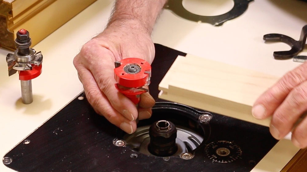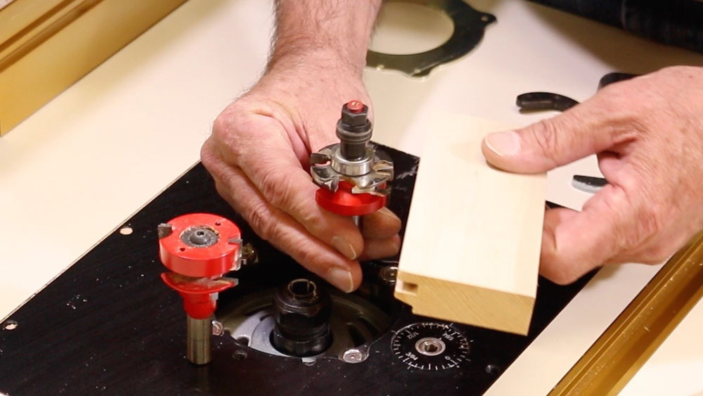 After the sticking cutter is set up and you have made a few test boards, remove the sticking cutter and set up the coping cutter. Match the stub tenon thickness to the panel groove thickness set up on the sticking cutter and match it to your test pieces. Adjust the height of the entire bit set carefully until rail and stile go together and the joint is perfectly flush, top and bottom.