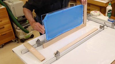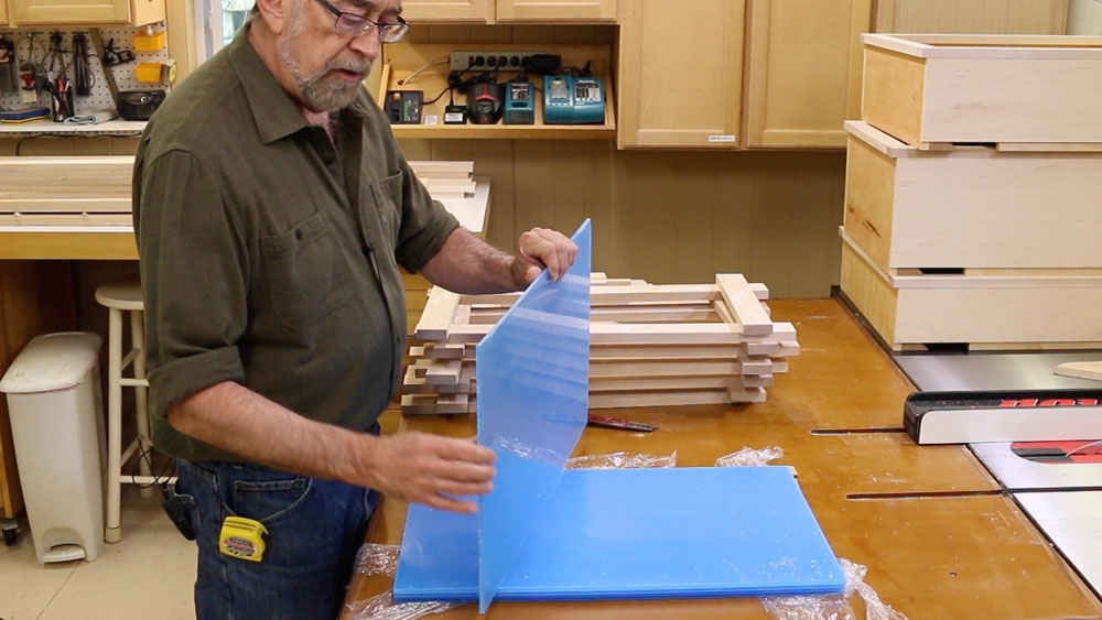 The clear plastic typically is supplied with a protective film attached. I left that film on and just peeled back enough from the edge so the panels would slide into the grooves in the doors. Later, when it is time to apply a finish, just mask the edges where the film was peeled back and the rest of the panel is already protected… a real time-saver.