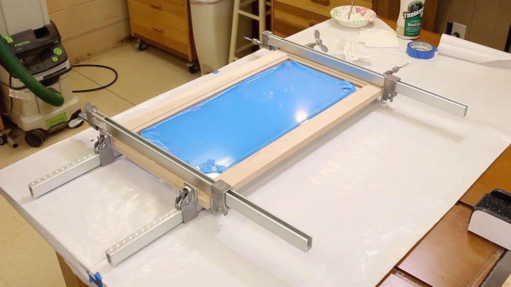 ), flip the doors over and remove any glue squeeze-out from the backside of the joints. I actually waited a little longer and used a card scraper when the glue was at what I call the "stiff rubbery" stage of drying.