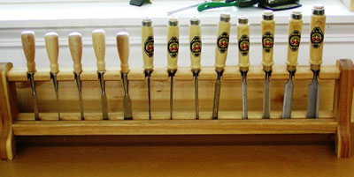 (those on the left, in the photo) over the larger selection of German-made Two-Cherries. The sides of the Lie-Nielsen Chisels are ground at a single bevel (as compared to the compound bevel on most others), which makes them especially useful for doing the close-in work of hand-cut dovetails. I also like the feel and balance of the smooth hornbeam handles (although I have had trouble keeping them on some of the chisels occasionally).