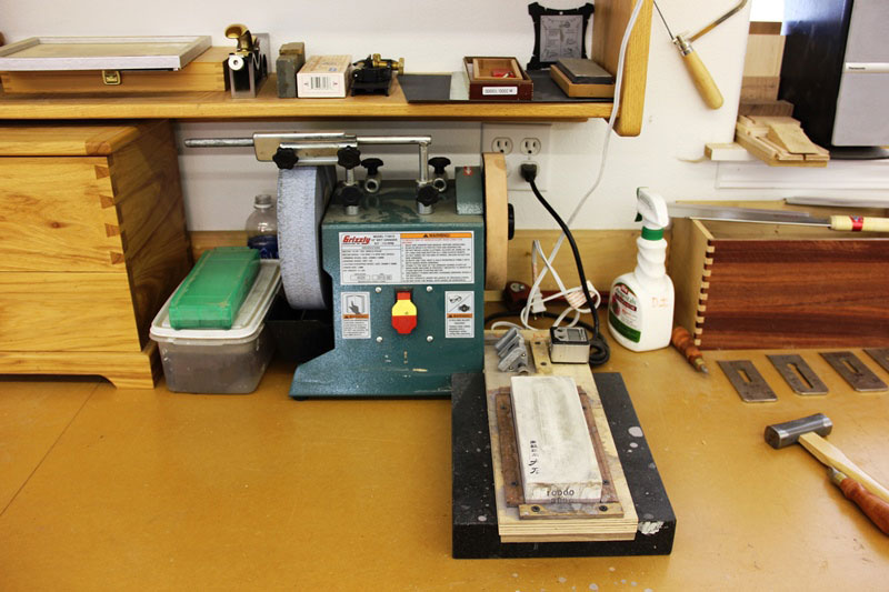 My Sharpening Station consists of a Grizzly water-cooled wheel sharpener for creating a concave blade end and an Ohishi combination Water Stone from Lie-Nielsen. These stones cut very quickly and are the best I've found for day-to-day plane and chisel sharpening and can be stored dry. The blade holder for sharpening (behind the stone) is not a very good tool, but