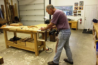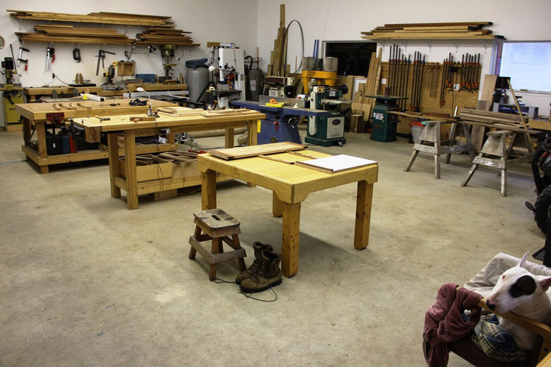 A woodworking shop is a very personalized place, as it should be. This is my third shop, and while still not perfect, it does correct some of the omissions and faults in my first efforts. A place where I'm going to be spending a lot of time concentrating on doing my best work needs to be, first and foremost, well-lit, a comfortable temperature, and easy to move around in. With that in mind, I built this shop a little oversized at 28' x 36' w/12' ceilings, (I know, a bit of a luxury for some of us), with lots of light fixtures and windows. I also put numerous electrical outlets (both 110 and 220v) scattered at different levels throughout the building (even on the ceiling!) and on a number of different circuits. Extra insulation in the ceiling keeps the place a comfortable temperature on the dark winter days (I heat with a small wood stove) and yet a cool sanctuary in the summer to escape to on hot days.