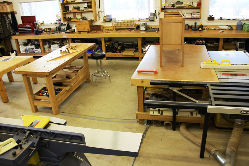The focus of my work area is the triangle formed by the table saw with a large push out/assembly table on one corner, a hand tool workbench on another and a joiner/planer on the third. The hand tool workbench receives natural light from the adjacent window and is also convenient to the sharpening station. I tend to move parts back and forth from the large assembly table to the workbench for fine-tuning with hand tools. I've tried various configurations and this seems to serve my purposes the best. It also gives me the convenience of having my most commonly used tools readily available, without having to carry stock all around the shop. All of the machines are connected to an Oneida Dust Collector.