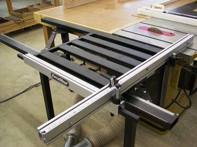 I like to use my table saw (instead of the chop saw) and its adjustable miter fence for doing most of my crosscuts, including cutting pieces to an accurate length and cleaning up the shoulders on tenons that I've cut on the tenon jig. As the fence (and width of the table saw top) limits lengths to about 24 inches of accuracy, I've been eyeing a sliding table saw extension for awhile. Seeing the box of a new Excalibur collecting dust for some time at my local dealer, we settled on a good deal for the woodworker and brought the tool home to my shop. The first thing I noticed was that the installation instructions were missing from the box, but an email to General Tools was rewarded promptly with the complete instructions attached.
