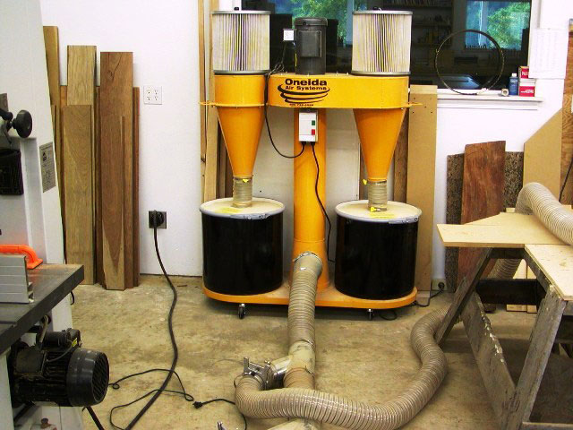 All of the machines are also connected to my Oneida dust collector, only having to make a few gate adjustments when switching from one machine to another. I purchased this dust collector directly from the manufacturer and, while doing the assembly, I found the upper manifold had been welded 180 degrees off-center and didn't line up with the base. A call and some emailed-pictures to Oneida, explaining my assembly dilemma, and they promptly sent a correctly manufactured piece (one does wonder about quality control with these companies sometime). The unit works well, providing plenty of suction to remove the chips and dust from the machines. But the filters are not easy to clean and the dust drums fill up quickly.