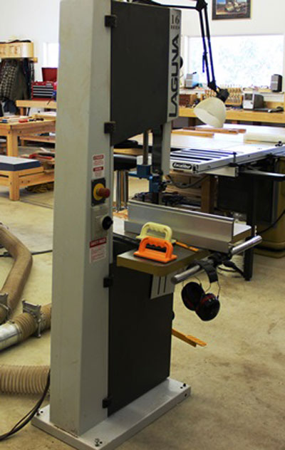 My Laguna 16 HD Bandsaw has been more than adequate for my needs, for both cutting curves and resawing. Made in Italy, as are many of Laguna's tools, it is smooth, plenty powerful and has been trouble-free so far. My only complaint was that a little wider of a table would go a long way for ease of use, especially with larger pieces and because I cut all my dovetail tail boards on this saw. Having an extra leaf from my Powermatic Table Saw after adding the sliding table extension, I recently attached the leaf to the side of the band saw to give me a comfortably-large surface for my tail board jig. I also replaced the blade with a