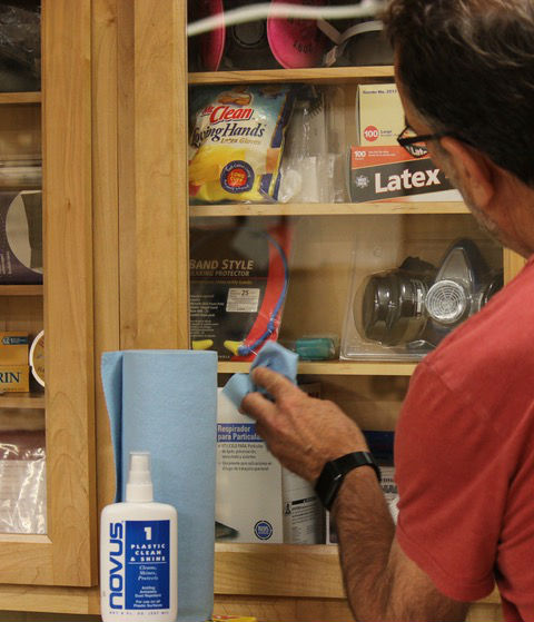 You use clear Plexiglas panels in shop cabinet doors. How should they be cleaned?