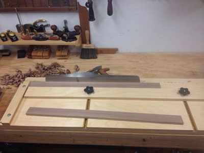 Aaron Moore of Walke-Moore tools taught me that the best way to do so is to shoot it square. In a perfect world, your straight edge would be perfectly flat on both faces and the faces on your vise would also be perfectly square and there would be no play in the lateral movement of your vise. You could cinch the straightedge bottom up in the vise, make a few passes with a plane, and it would be ready for work. However, it is more than likely that one or more of the aforementioned components will be slightly off, thus introducing twist when cinching the straight edge in the vise. When the edge is jointed with that forced twist the jointed edge will no longer be square when removed from the vise. It is best to shoot the edge square with the straightedge in it's natural state, along the grain. The long-grain shooting board is another article in and of itself, but thankfully Aaron has already written it. To find out how to make your own long grain shooting board, read the whole article