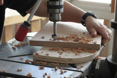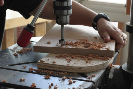 Then she drilled out the hang hole with the forstner bit.