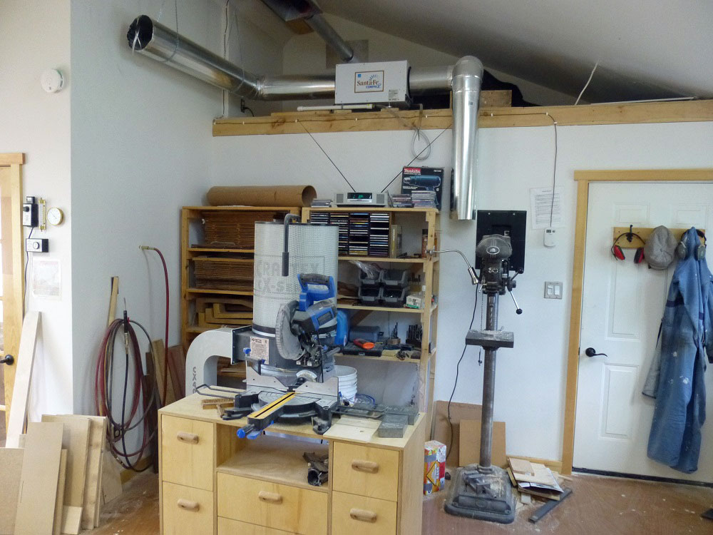 Heating the shop is accomplished using a propane radiant tube heater. This system offers many advantages for me. It hangs from the ceiling, leaving me with all my valuable wall space. It also has sealed combustion so that it does not affect my climate control by exhausting interior air. There is also no chance of an open flame igniting sawdust in the air.