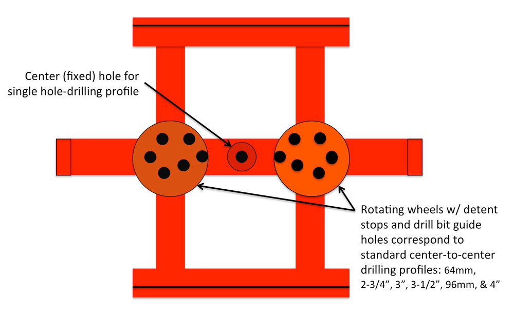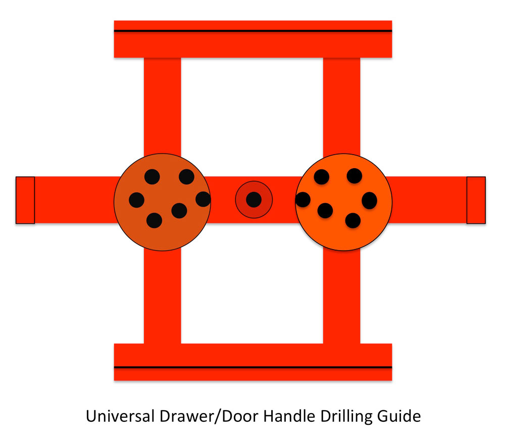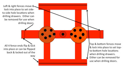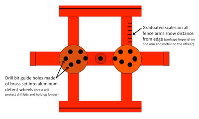 Four precision guide arms would set the distance down from the top of the drawer edge, up from the bottom, and center the holes side-to-side or at desired locations via two adjustable centering/independent fence arms. Each of the four guide arms could be removed from the jig. When drilling holes on cabinet doors, two arms would locate the holes precisely. The guide arms would all include graduations in metric and Imperial, and at each end a flip-down lockable fence. If you want to reference off the left face for a drawer pull, flip the fence down on the left side arm. Then flip that fence out of the way and flip the fence down on the right side arm, move the jig, and drill a perfectly located/matched pair of holes for the other pull.