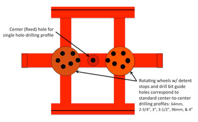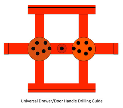 The heart of the jig would consist of two click-stop wheels that turn in unison, stopping on common drawer pull drilling center locations (64mm, 2-3/4", 3", 3-1/2", 96mm, & 4"). No chance of these getting out of adjustment. There would also be a fixed hole in the middle of the jig for drilling single holes for perfectly placed knobs. The whole unit would of course be made of that awesome aircraft grade aluminum that Woodpeckers uses, but each drilling guide hole should include a brass insert so that drill bits and the guide holes last longer.