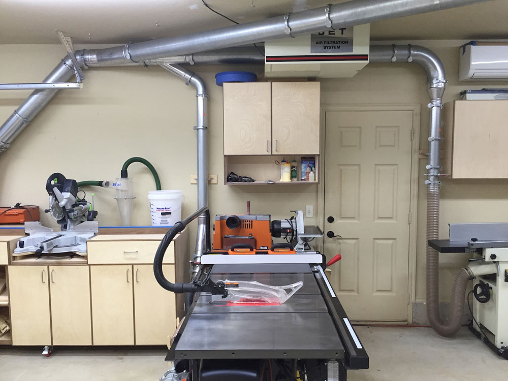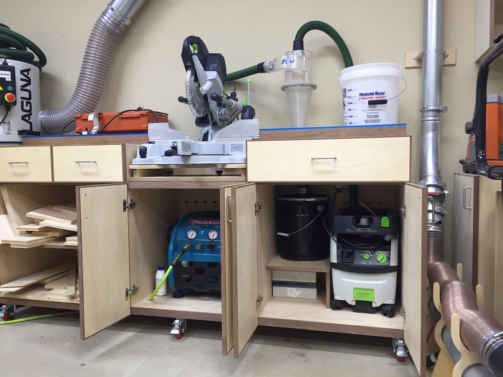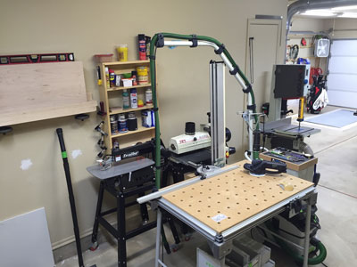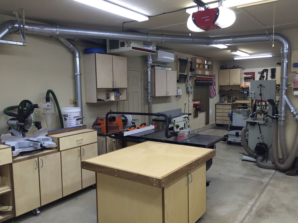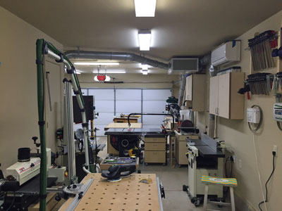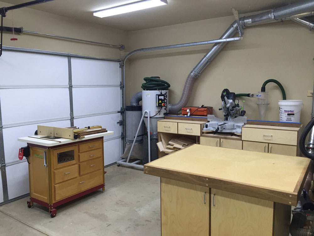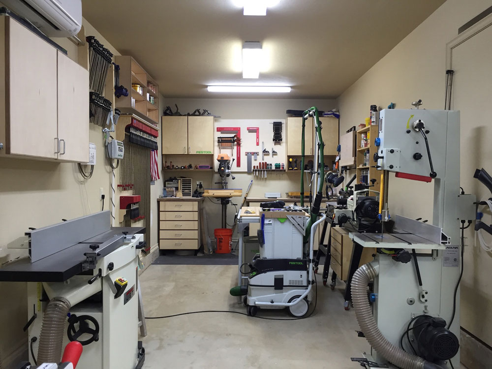 My shop is my 2-car garage, 20' x 20' with a 9' x 16' tandem nook in the back where I will have my future Split Top Roubo. I like the shop to be organized and I'm constantly thinking of ways to improve efficiency in my shop. I built all the base and wall cabinets in my shop and everything has its own place. I know exactly where everything is at all times because I keep my shop very clean. All of the large machines are connected to a Laguna 2hp Cyclone Dust Collector via 6" Nordfab ducting, with a total of 3 drops and 5 blast gates. All of my smaller tools are