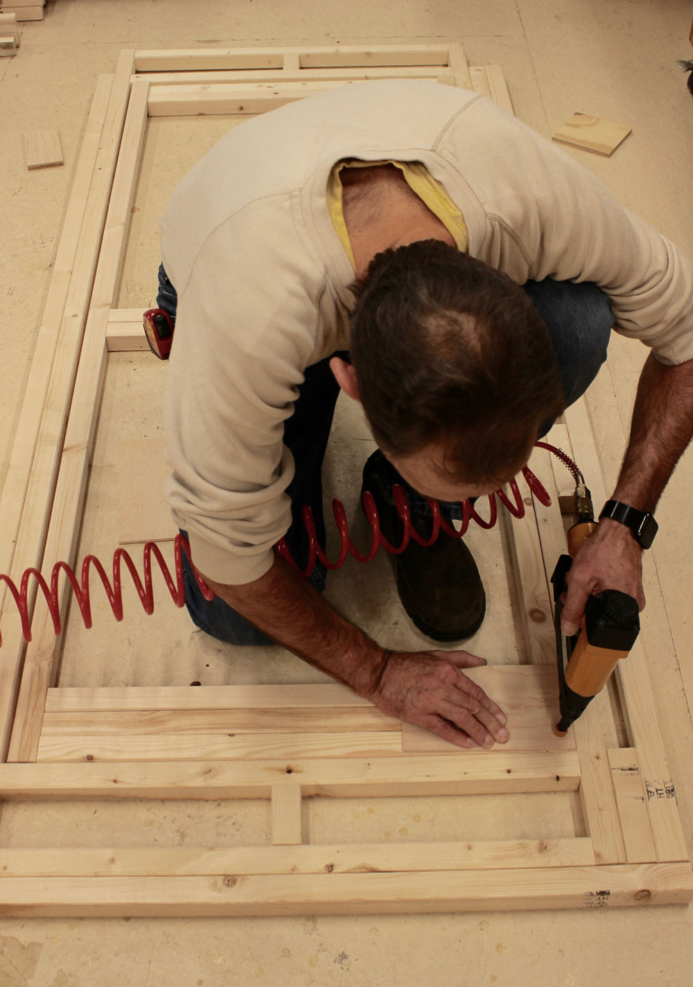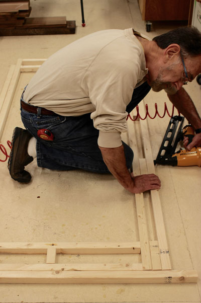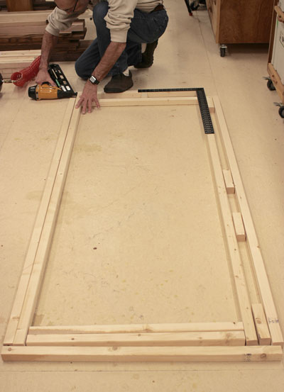 After all the pieces are cut, assembly can start. I spread mine out on the floor so I would be able to take pictures more easily… if you have a workbench large enough, assemble it there… it is definitely easier on the back! You will want to assemble the door from the inside-out, meaning start by nailing together the innermost frame pieces first so that there is no need for toe-nailing. Use a framing square and get the assembly as square as possible.