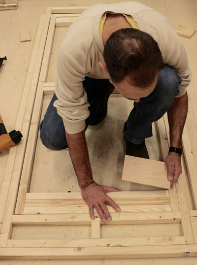 After the doorframe is assembled, measure the width and height of the opening. Subtract 1/2" from both the top-to-bottom and side-to-side measurements and the result is the size you want to build the door. Cut the pieces and lay them on the floor inside the frame, just like they will be assembled. Here is a little trick…