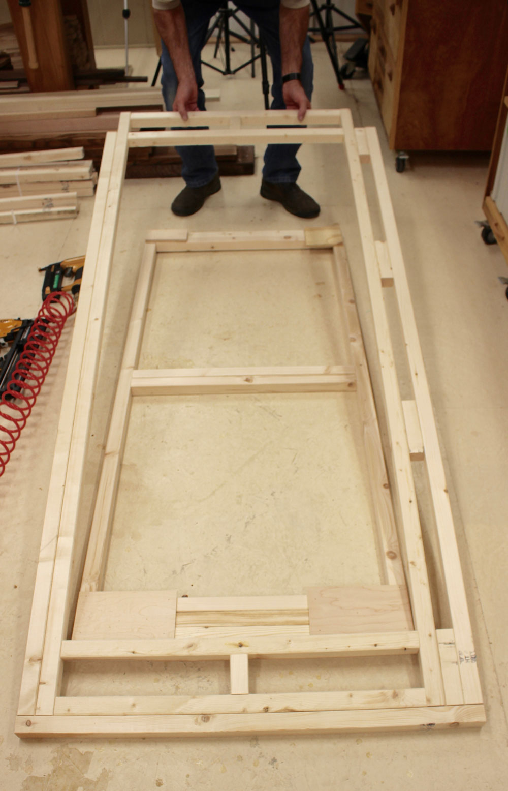 First cut the side vertical members of the doorframe to length. Make the horizontal pieces next, measuring and cutting as you go. You can do this on top of a work surface or on the floor. Use clamps to hold things together temporarily as you continue to measure, cut, and dry-fit the pieces.