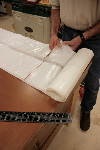 Using some scrap stock as shims, position the door inside the opening with an equal amount of space on all four sides. Use enough shims that the door will not move. The 6 mil plastic I used comes on a roll 10' X 25'. Unroll an amount equal to the width of the doorframe plus 6-inches, make a square mark, and cut the roll with a pair of scissors. You will wind up with a piece of plastic 10' long by the width you cut.